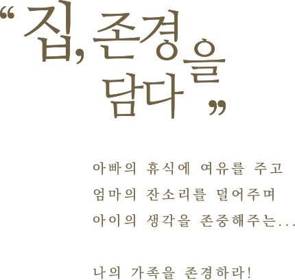 아빠의 휴식에 여유를 주고 엄마의 잔소리를 덜어주며 아이의 생각을 존중해주는··· 나의 가족을 존경하라! 아너스빌의 존경을 담아 짓는 집은 많은 것을 달라지게 합니다. 사랑하는 가족의 삶에 대한 존경을 담아, 더 나은 라이프 스타일을 실현합니다. 집, 존경을 담다 경남아너스빌